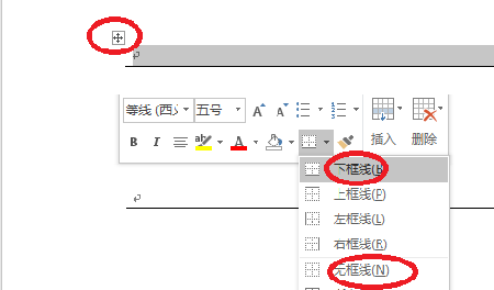 5、在插入的表格,点击十字标志,先选择无框线,再选择下框线。