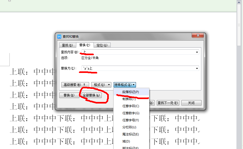 ctrl+f 替换,查找内容为“上”,替换为“段落标记+ 段落标记+ 上 “” 全部替换,图中带p的符号就是点两次那个段落标记
