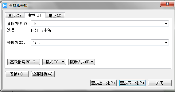 第二次替换,把 “下” 替换成“段落标记+下“ 全部替换