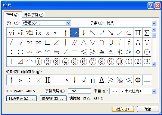 2、弹出符号对话框,选择向左或向右箭头即可,如图所示。