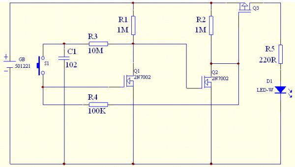 图中的CD4010不就是反相器功能,用MOS管不也可以实现反相器功能,功耗也很低。就按上图电路的框架用两个MOS管构成两个反相器,开关、电容、电阻的位置接点与上图一样。然后先用软件进行仿真测试一下功能可不可以?可以后马上进行实物搭板测试,并调整了一下电路参数。实测电路在4.2V时工作,功耗在4微A左右。经过几天的试用,感觉很好用,在原来开关的位置上多并几个开关,就可以变成一个多处共控一个灯的电路了。