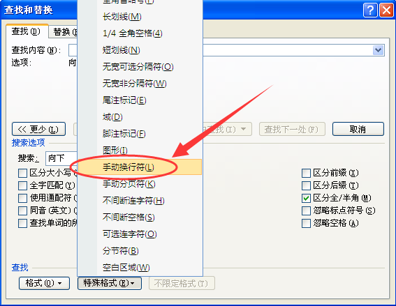 2、弹出查找和替换对话框,单击特殊格式按钮,在弹出选项中选择手动换行符;