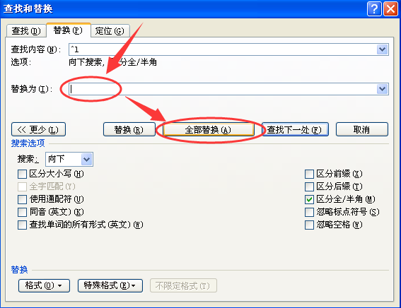 3、切换到替换选项卡,替换为输入框空着,单击全部替换按钮即可。