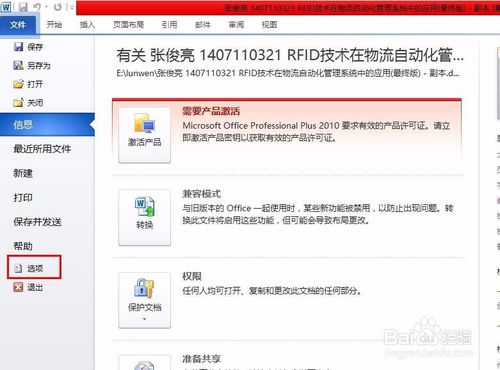 3、进入文件之后,在左下角找到并点击“选项”,进入到word的设置界面中。