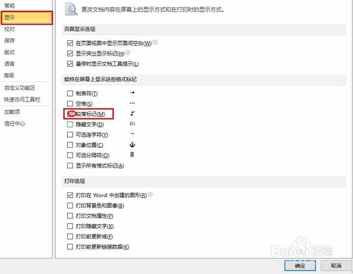 5、进入到显示栏目界面中,在中间,我们可以发现一个选项“段落标记”,去掉其前面的“√”,然后点击下方的“确定”关闭设置。