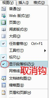 方法一、单击Word菜单栏的“视图”,在下拉列表中将“显示段落标记”前面的勾取消即可。