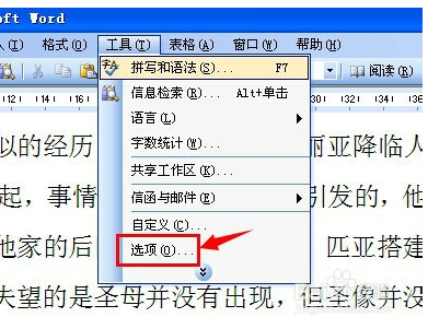 2.点击工具按钮后,就会出现下拉菜单,找到“选项”。这是找到分节符的必要过程,务必仔细保证顺利分节符。