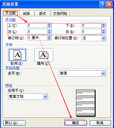 2、在“页面设置”对话框中点击“页边距”标签,将“上、下、左、右”后的数字修改为“0”,点击确定;
