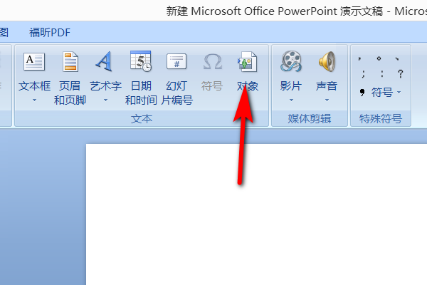 第一步:新建PPT文档(或者打开已有PPT文档),如图,切换到插入选项卡,单击对象按钮,打开插入对象对话框。
