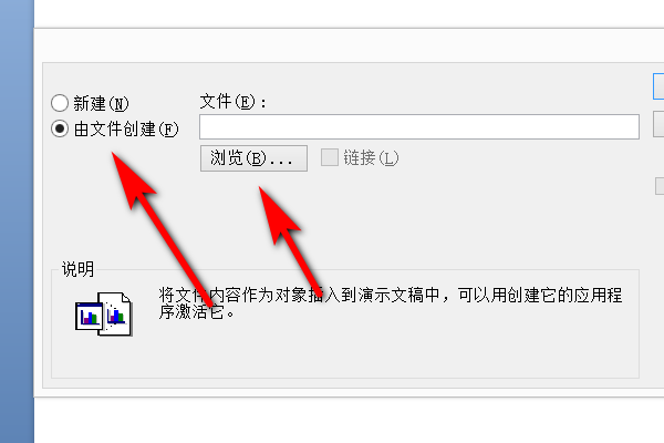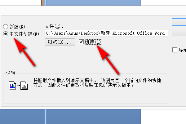 第三步,在第二步操作当中弹出的窗口中点击由文件创建,然后选择需要插入的word文档,最后勾选链接