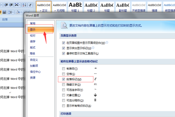方法一:这一方法非常简单,只要更改一个设置就行了。先点击office徽标,在最底下的点击“word选项”,弹出来了一个窗口。在这个窗口左上角选择“显示”,最后在里面找到“段落标记”这个框,去除里面的“勾”即可。具体