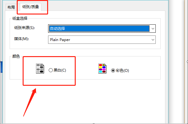 3、在弹出的属性设置框里,单击“纸张/质量”一项,里面的颜色选择“黑白”,点击,最后点击下面的确定,这时打印出来的文档就是黑白的了。