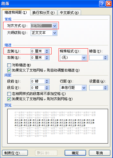 5、弹出段落对话框,在对齐方式处选择左对齐;在缩进处,左侧缩进后的输入框输入0;在特殊格式处选择无即可,如图所示。