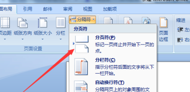 4、这样就会弹出了一个下拉菜单中进行选择为“分页符”的选项。