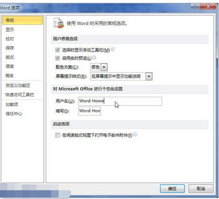 2、在打开的“Word选项”对话框中切换到“常规”选项卡,然后在“对Microsoft Office进行个性化设置”区域设置“用户名”和“缩写”选项,并单击“确定”即可完成。