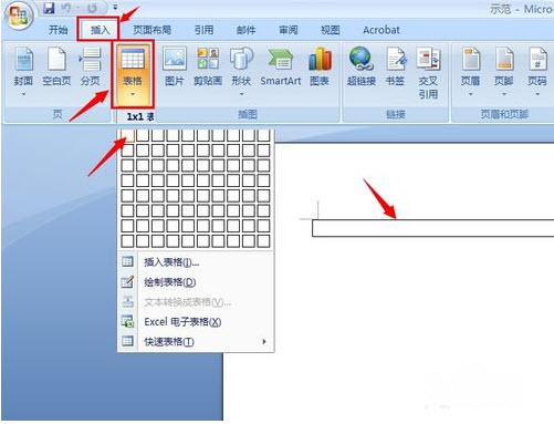 1、切换到“插入”标签,点击“表格”,插入一个“一行一列”的表格。