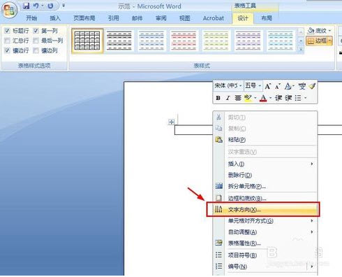 2、对着表格,按右键,选择“文字方向”。