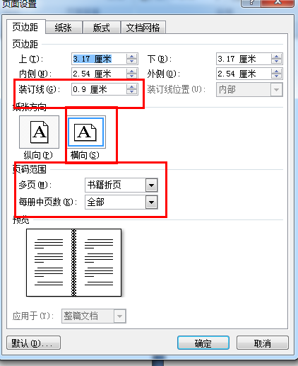 打开页面设置,先在“纸张”标签页中设置好纸张大小,比如A4。切换到“页边距”标签页中,在“页码范围”多页中选择“书籍折页”,设置设置好上、下、内、外边距后确定。注意一点这里的“内”其实是书的外侧,“外”其实是装订的那一边。
