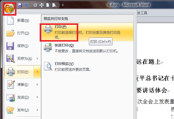 1、在 Word 中打开一篇文档,点击“文件”——“打印”菜单项,准备开始打印工作。
