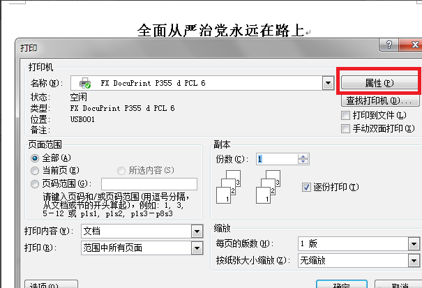 2、弹出“打印”对话框,在“打印机”名称框的左侧,点击“属性”按钮,点击此按钮,开始设置小册子打印。