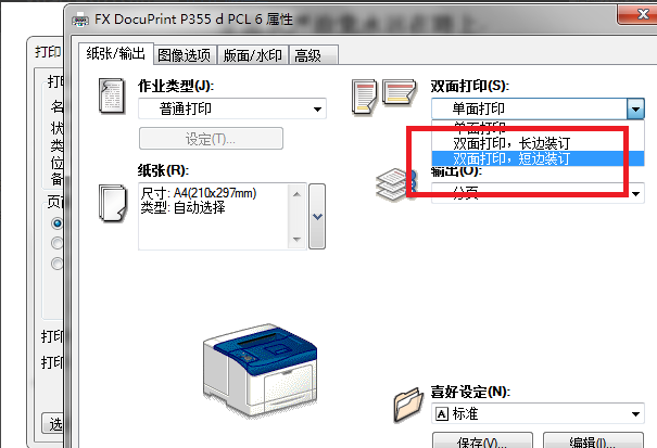 3、弹出打印机属性对话框,在“双面打印”部分,点击下拉菜单,选择“双面打印,短边“装订。(目的是为了在小册子打印时,不会出现正反面方向倒置的情况。)