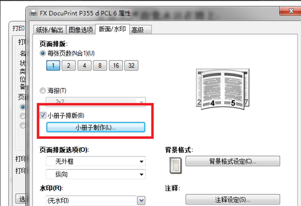4、在打印机属性对话框,点击“版面/水印”选项卡,在“页面排版”部分,选中“小册子排版”复选框。