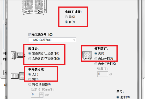 5、点击“小册子排版”下方的“小册子制作”按钮,进入“小册子制作”对话框,在这里可以对“装订边”、“中间装订线”、“分割装订”等选项进行设定。保持默认也没问题。