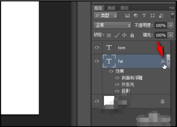 3、此时我们看到FAT图层的右侧有两个小字母:fx;左手按住ALT键,右手控制鼠标点住fx。