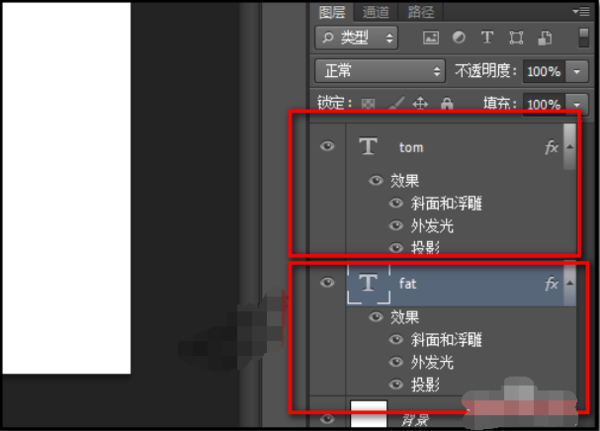 4、左手不放手,鼠标拖动标签拖到TOM图层上。放开鼠标,放开左手。这时,我们可以看到,TOM图层自动添加了与FAT图层一样的图层样式。
