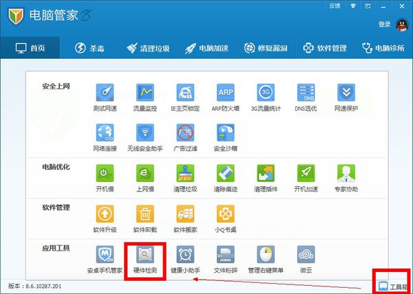 3,使用电脑管家——工具箱——硬件检测,看下您的电脑温度尤其是硬盘温度是否过高。