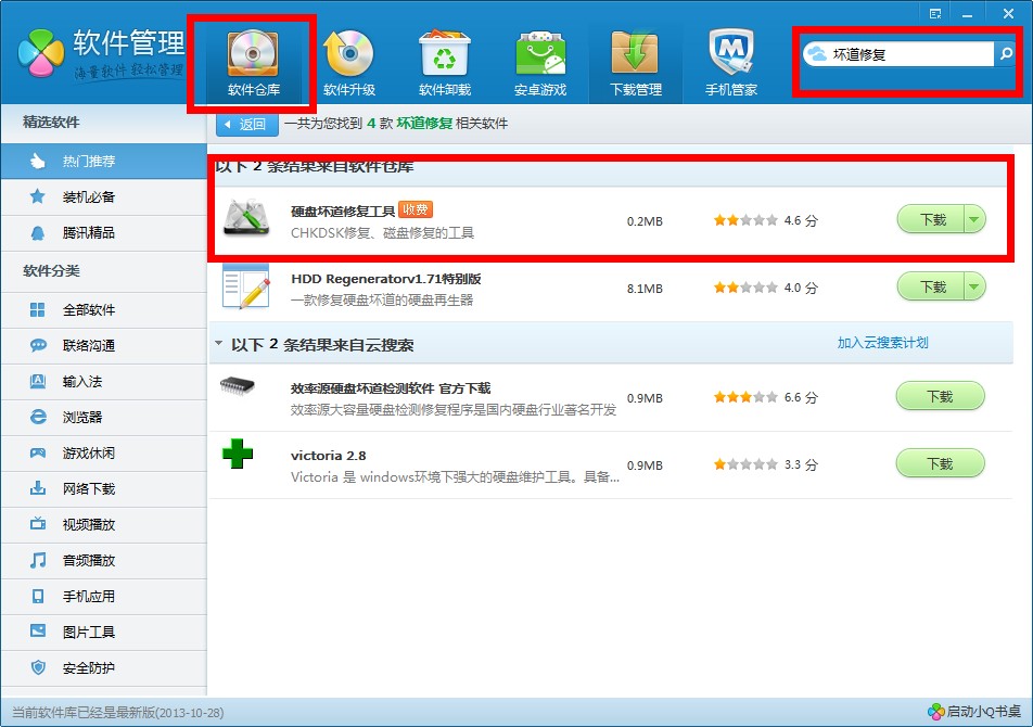 4,然后再打开电脑管家——软件管理——软件仓库——右上角搜索【修复坏道】下载一个工具,检测一下硬盘是否有坏道,有的话修复一下。