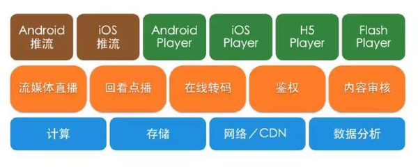 CDN,然后提供了数据分析的能力。我们依托它做了橙色的这一层,就是我们自己的核心,流媒体直播,然后围绕这个核心我们在做的回看点播、在线转码、鉴权、内容审核。