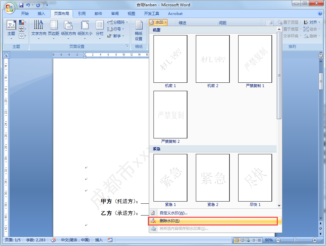 3、在点击水印后的下拉菜单中选择“删除水印选项”即可去除水印,如下图所示。