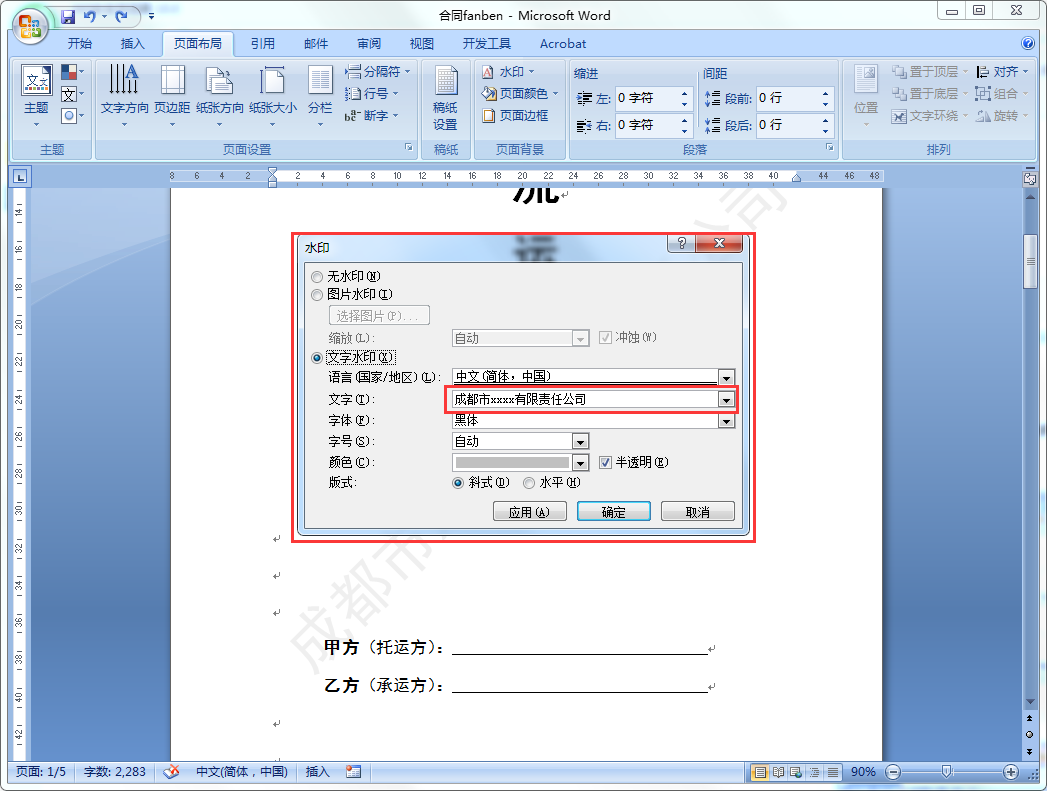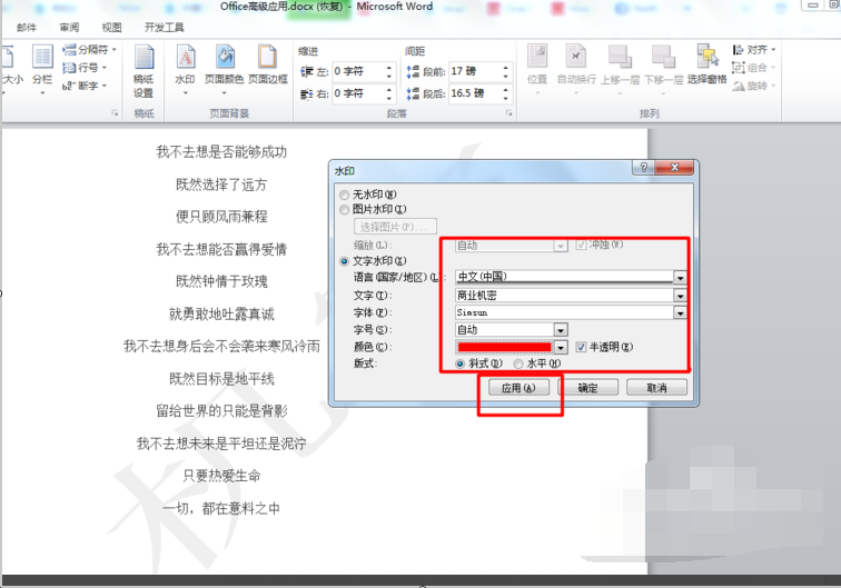 如果需要加深,可在设置水印时的对话框中选择深一些的颜色,并去掉半透明的勾