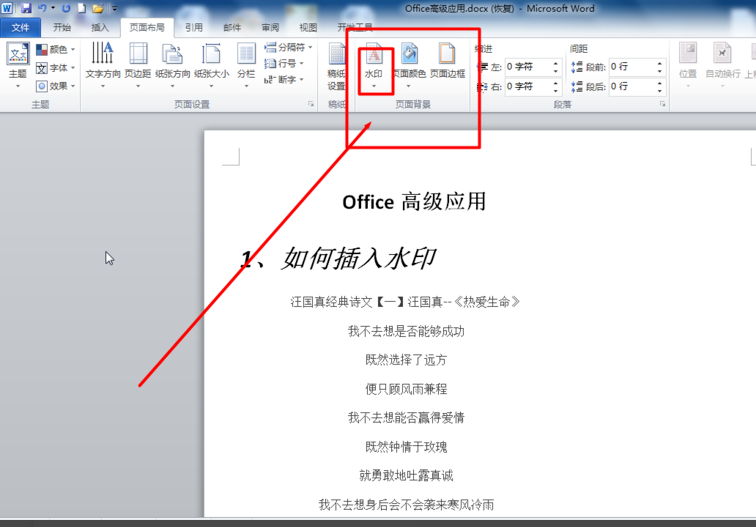 1、在“页面布局”选项卡中,有“水印”这项,单击“水印”,
