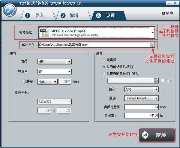 flash转换成swf相信不用我多说,直接保存另存为swf格式就可以,接下来就是用把swf文件添加进去,然后直接选择MP4格式就可以了。ps:flash也可以直接添加进去进行转换,flash跟swf这2种都是动画的格式