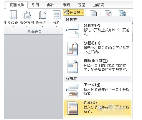 单击“页面布局”选项卡,单击“分隔符”下拉列表,单击“分节符-连续”,向第一节的末尾插入一个新的分节符。