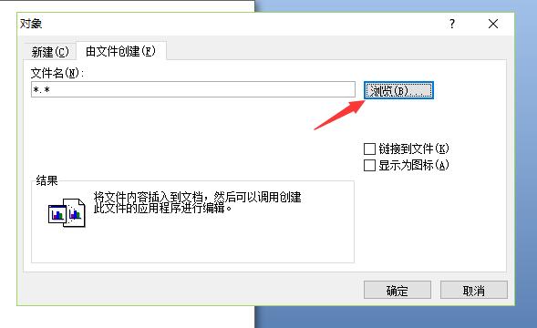 2.在对象对话框中点击“由文件创建”,然后点“浏览”,找到刚刚保存的Excel文件,点击“插入”,再点“确定”。
