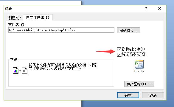 5.然后可以选择显示为图标,也可以选择链接到文件,根据个人需要进行选择,如下图所示;