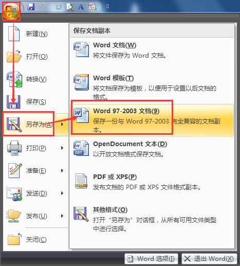 1、更改默认保存格式:单击Word 2007左上角的“Office按钮”,在展开的菜单中单击“Word选项”按钮打开“Word选项”,接着打开“保存”标签页,设置“将文件保存为此格式”下拉列表为“Word 97-2003 文档(.doc)”,这样的话以后就会默认保存为doc格式了。