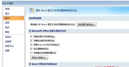2、在打开的选项窗口中,切换到“校对”选项卡,在右侧窗口中找到并禁用“键入时检查拼写”、“键入时检查语法”和“随拼写检查语法”的选项。