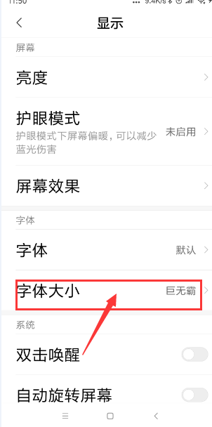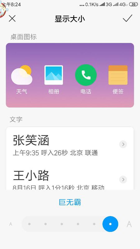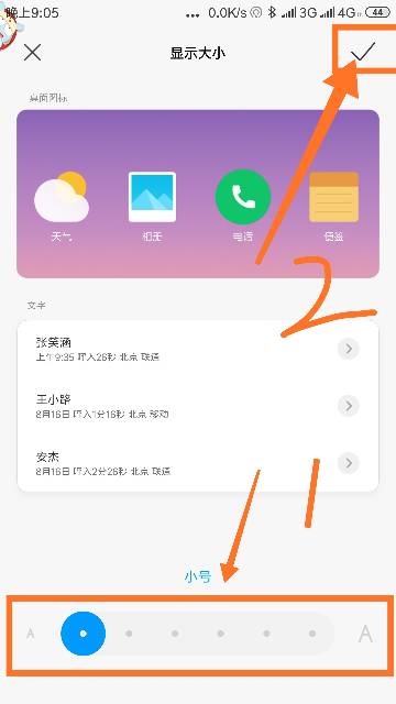 打开手机自带设置→显示大小→选择你要设置下小→打上勾确认。