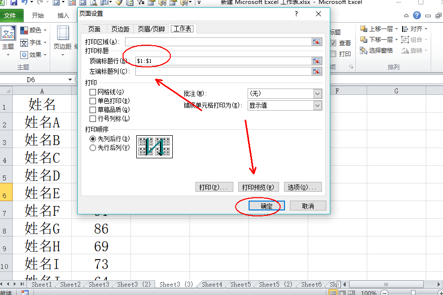 2、在顶端标题行的输入框中输入$1:$1,并点击确定即可。