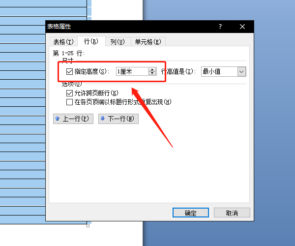 2、双击表格左上角的十字,设置表格的固定行宽,设置为1cm(或者1.2cm)。