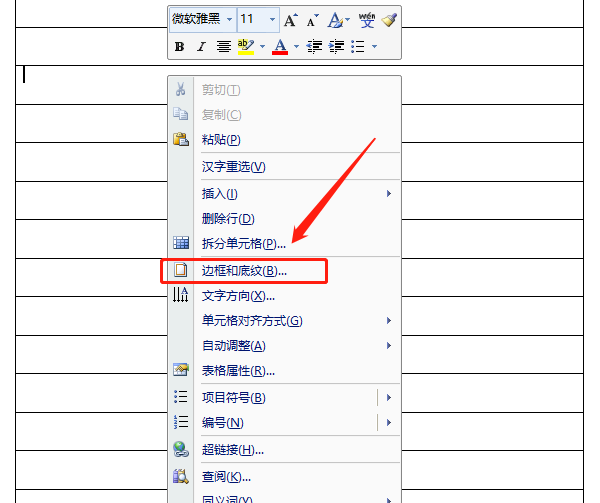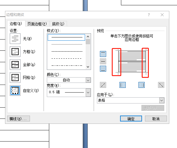3、信纸是没有左右边线的,在表格上右击选择边框和底纹。在右边的那个示范表格的左右分别点一下这样表格的左右边线就不会显示了。