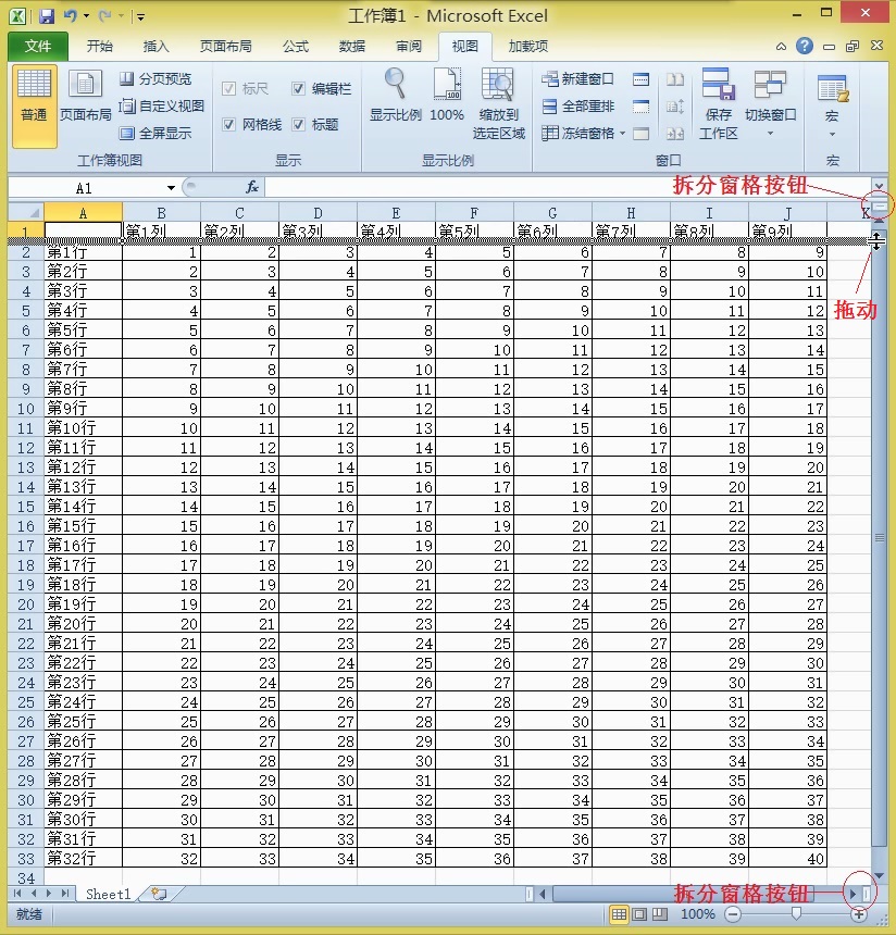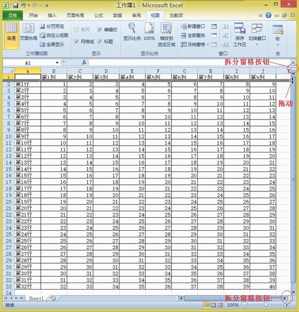 第一步:新建或打开Excel文档,如图,切换到“视图“选项卡,单击并按住拆分窗格按钮拖动拆分窗格(行、列均可)。