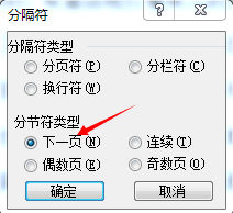 2.选中“分节符类型”中的“下一页”选框后点击确定按钮, 等整个文章分好节以后,就可以点击“视图”菜单→“页眉与页脚”命令进入页眉编辑模式了。