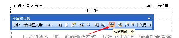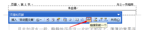 3、单击页眉和页脚---->链接到前一条页眉按钮,断开与前一节的联系;