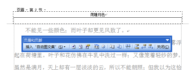 第二步,将会看到页眉页脚编辑工具栏,同时切换到页眉页脚的编辑状态,会在页面的顶部和尾部看到页眉页脚的编辑框。