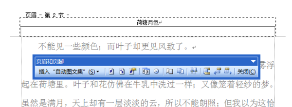 3. 然后再从“页眉与页脚”工具栏中点击“显示下一项”按钮,跳转到下一节的页眉处,此时,我们应该点击页眉与页脚工具栏中的“链接到前一个”按钮切断第2节与前一节的页眉内容联系,然后再输入想要的内容。